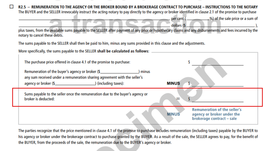 If the amount of the commission is included in the selling price, you’ll find the details in clause R 2.5 of Appendix R in the offer to purchase used by the broker. Make sure the amount indicated in the appropriate location (shown in the red box in the image below) is actually the amount you wanted to get from the sale of your property.
