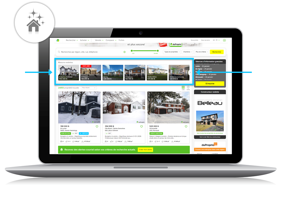Le bandeau Maisons-vedettes est un service qui offre une visibilité accrue de votre annonce sur DuProprio.com, puisqu'il permet à votre propriété d'apparaître dans le haut des résultats de recherche par liste.