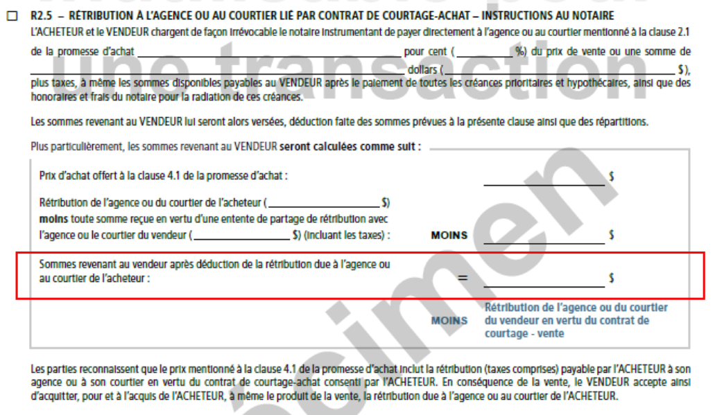 Si le montant de la commission est inclus dans le prix de vente, vous trouverez les détails à la clause R 2.5 de l'annexe R de l'offre d'achat utilisée par le courtier. Assurez-vous que le montant indiqué dans l'encadré à cet effet (en rouge dans l'image suivante) reflète réellement ce que vous vouliez obtenir pour la vente de votre propriété.